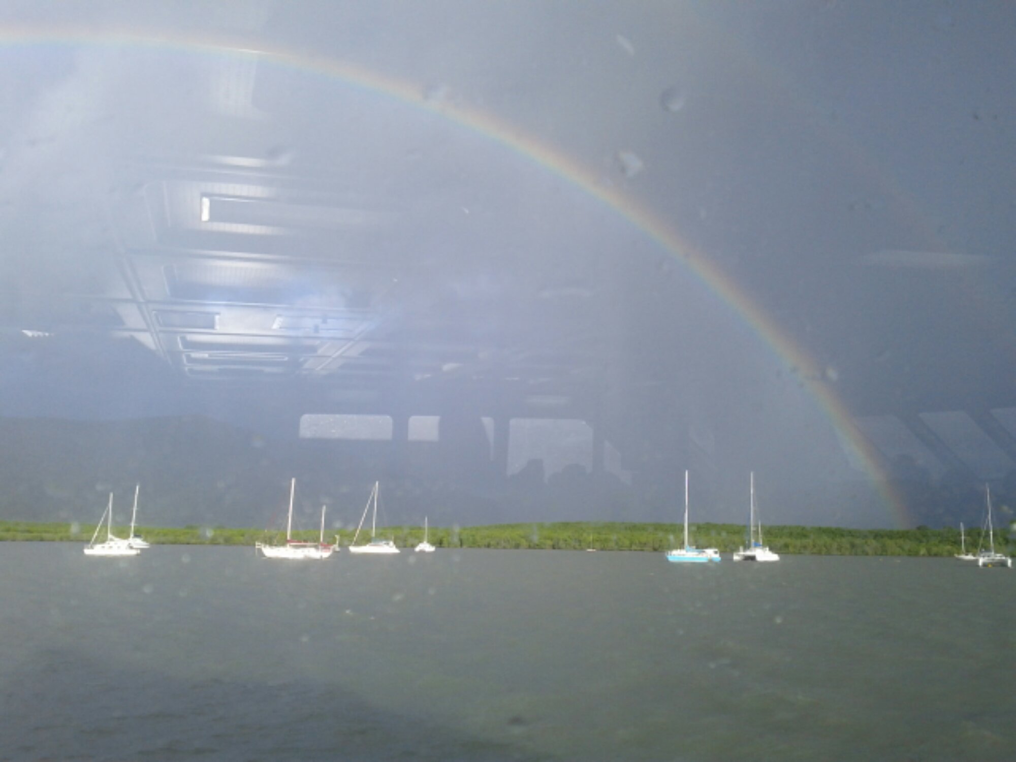 Afortunadamente, el viaje de vuelta ha sido mucho más tranquilo al parar el viento y como estaba constantemente con chaparrones, la llegada al puerto de Cairns nos ha obsequiado con un arco iris completo espectacular