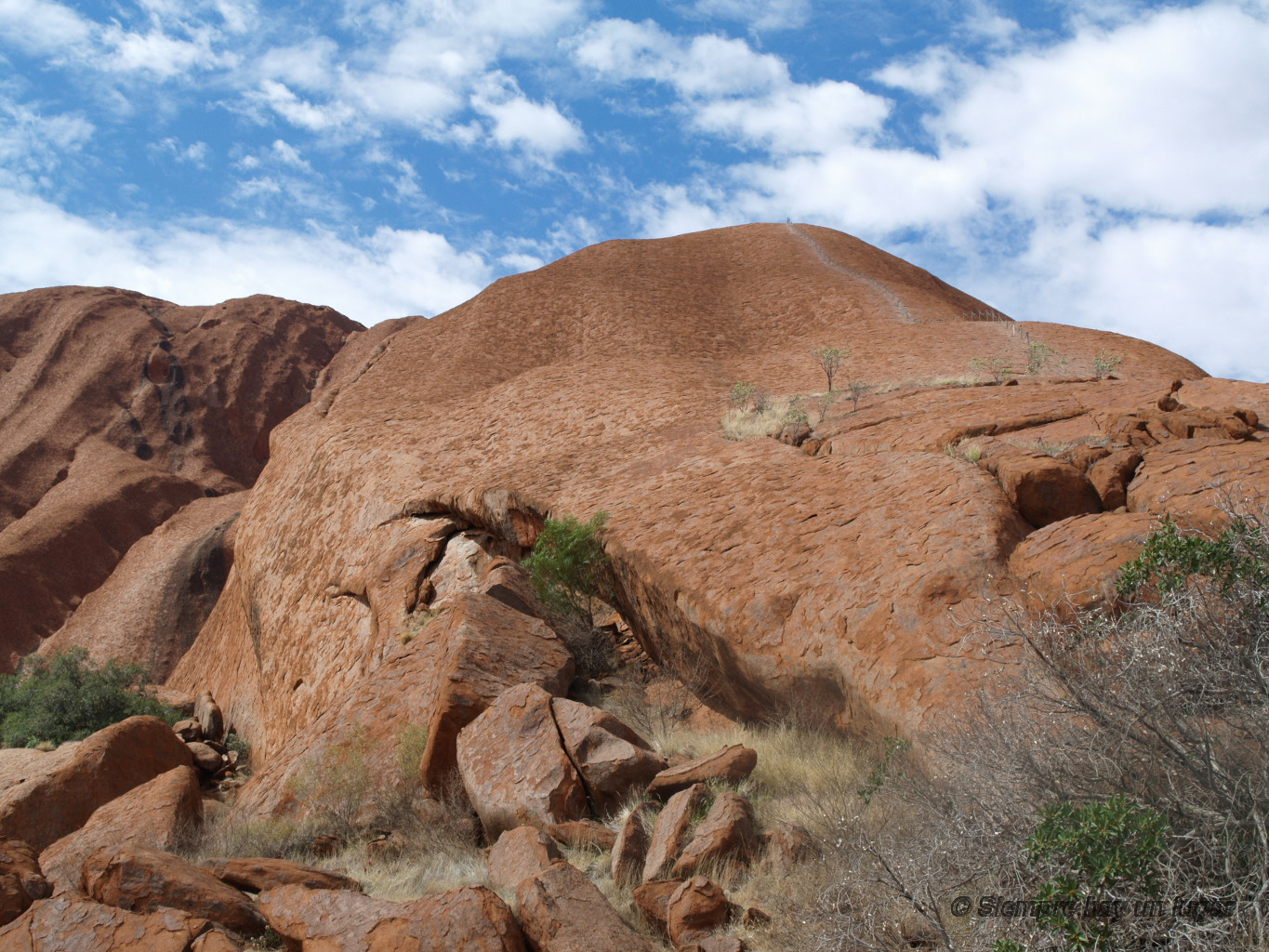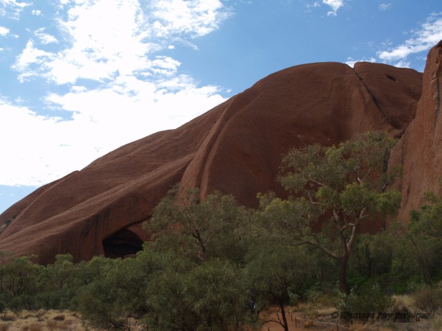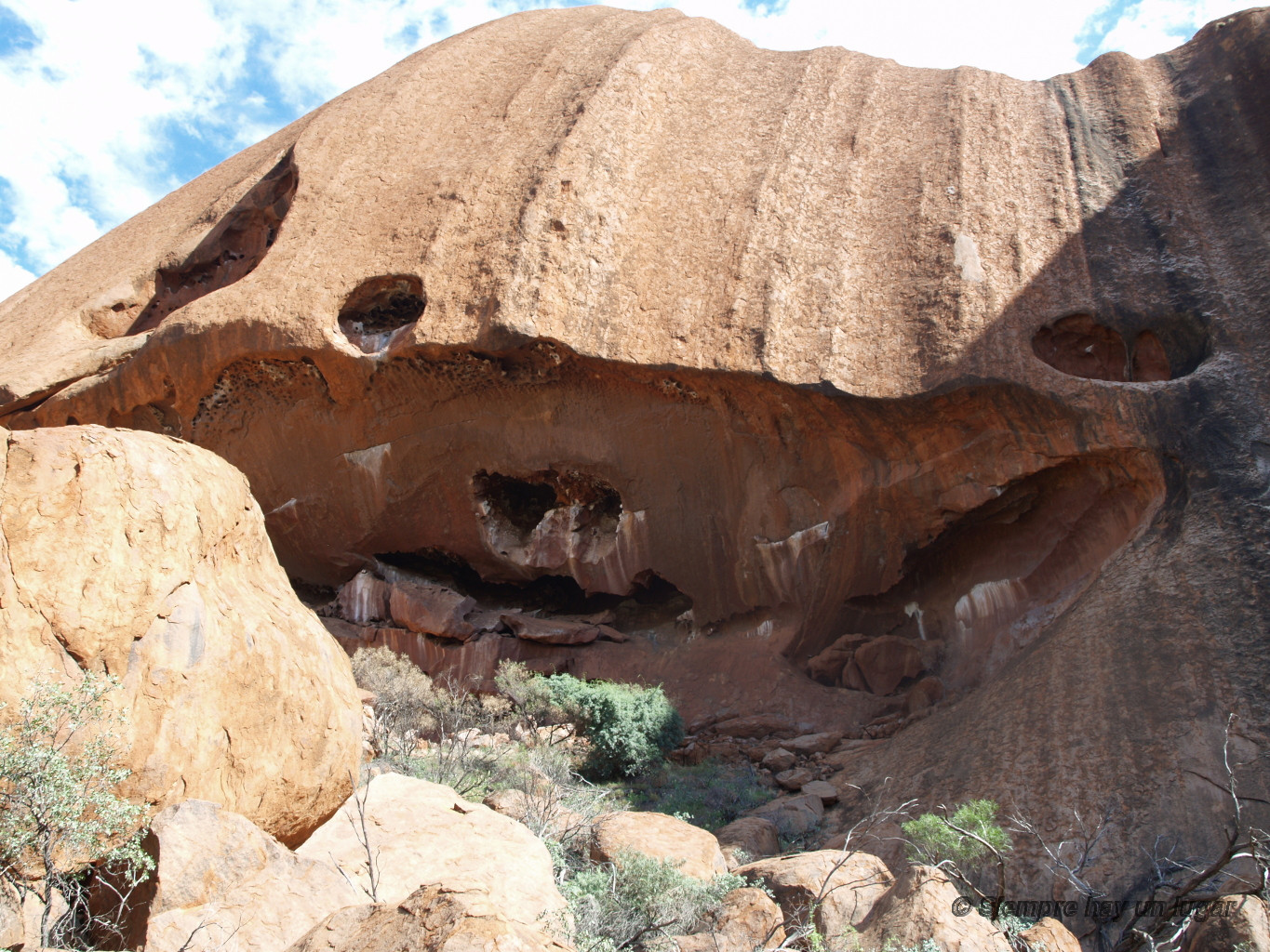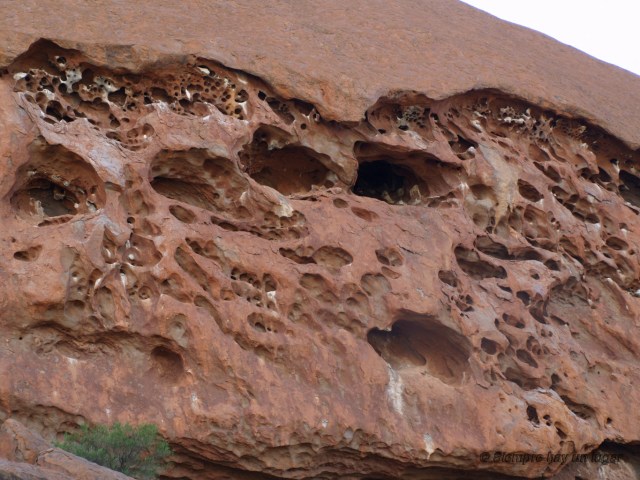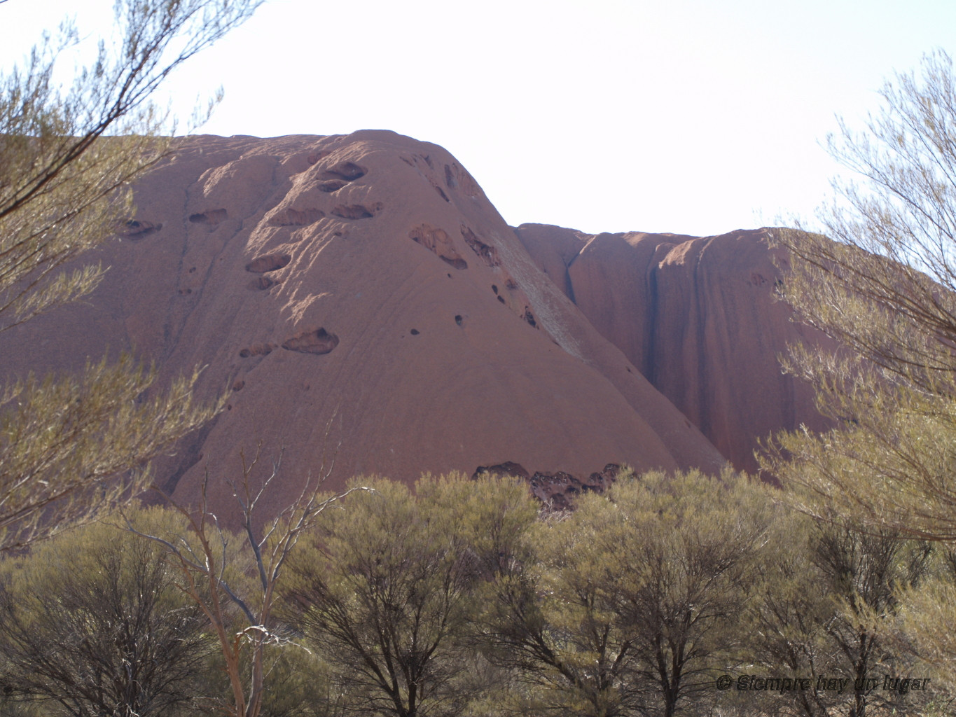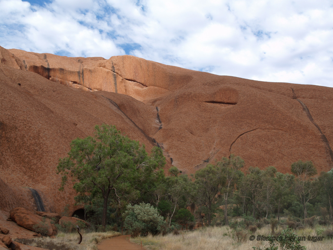 Uluru es mágico. No lo podría describir de otra manera. No me preguntéis por qué, no me pidáis que os describa que es lo que pasa cuando te acercas a las impresionantes paredes horadadas por las aguas que caen desde la cima cuando hay lluvias. Unas paredes con manchas negras que no son sino algas que se han acostumbrado a sobrevivir con los escasos aportes de agua que reciben en el centro del desierto australiano, uno de los más grandes el mundo.