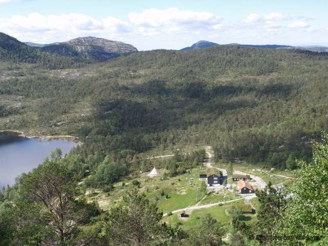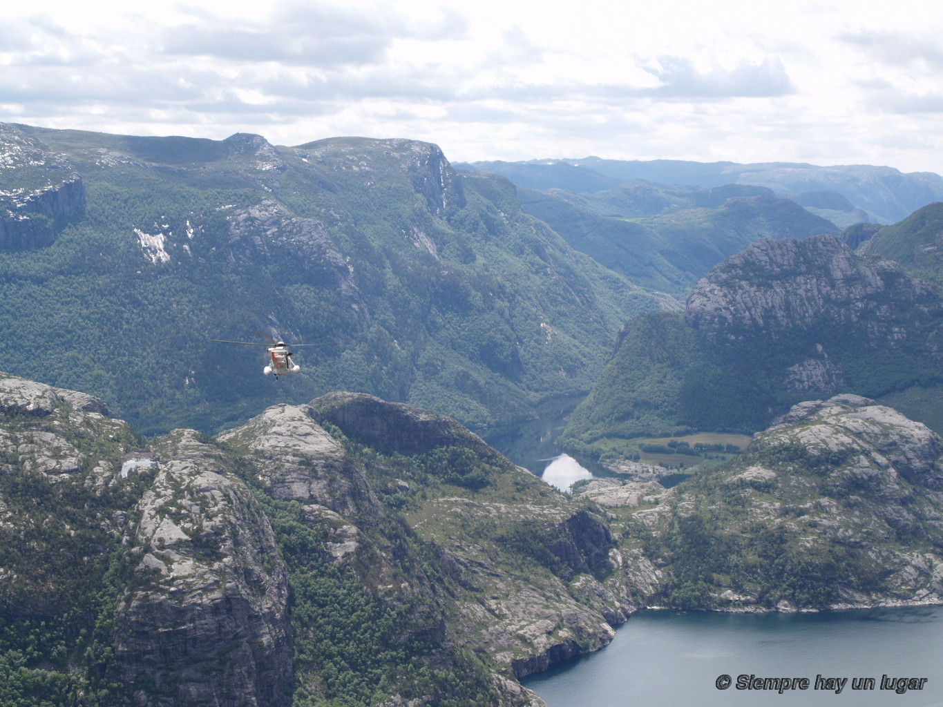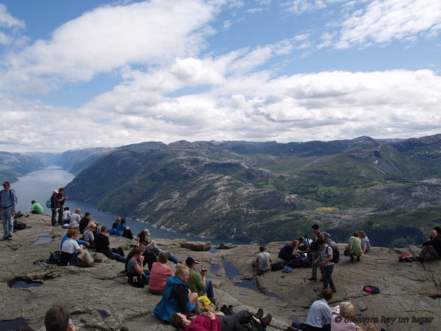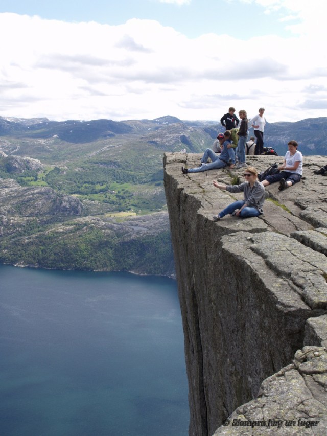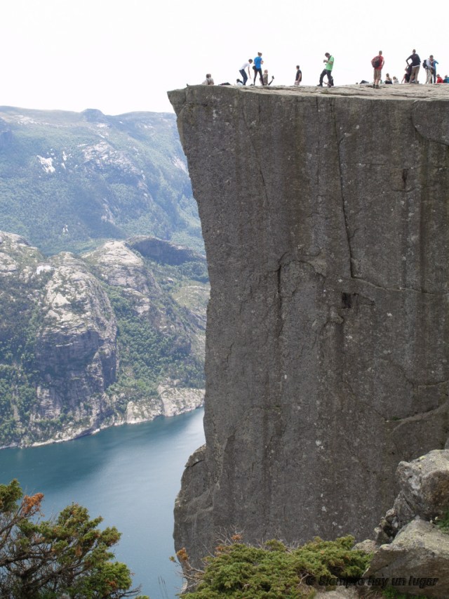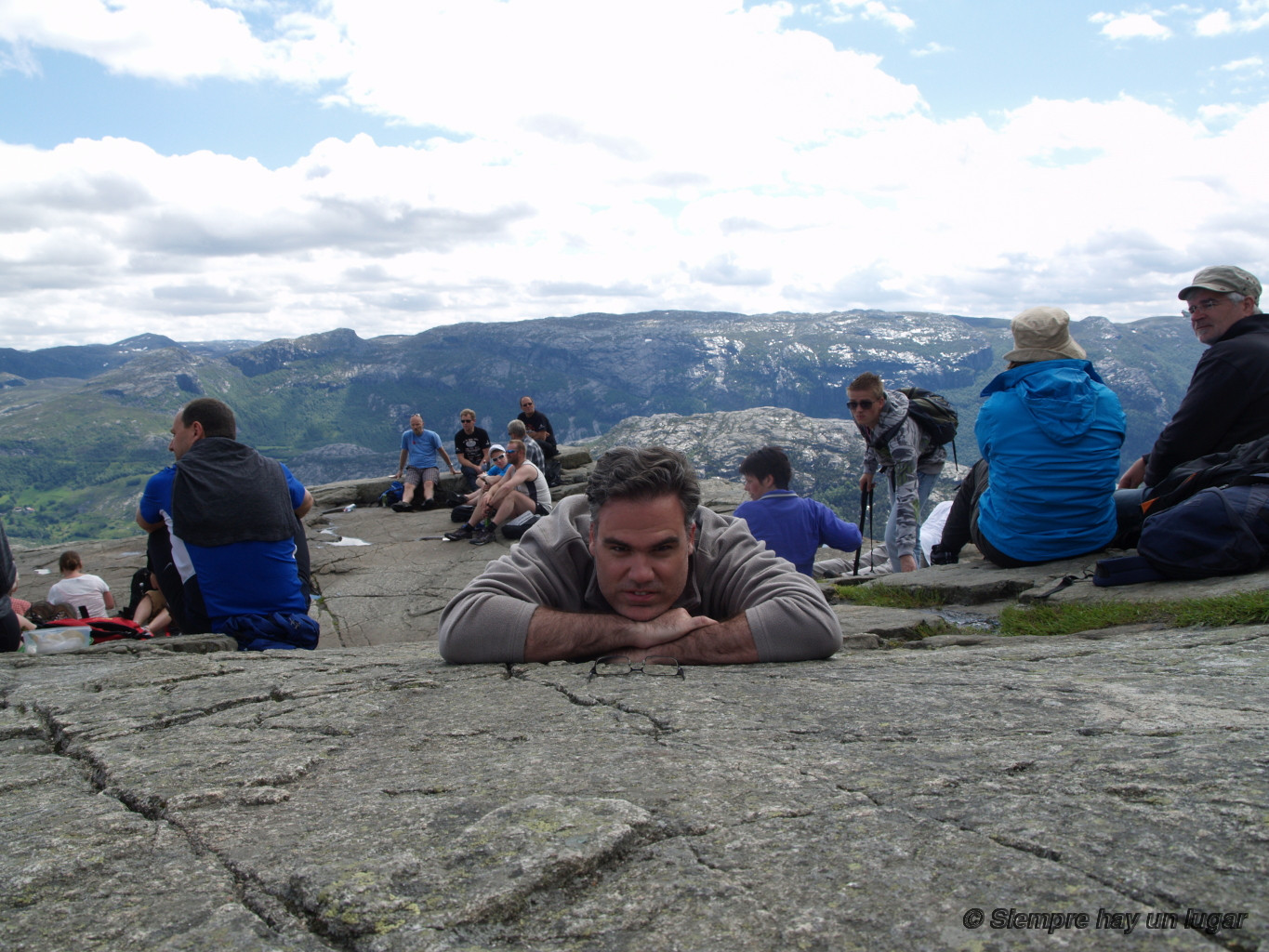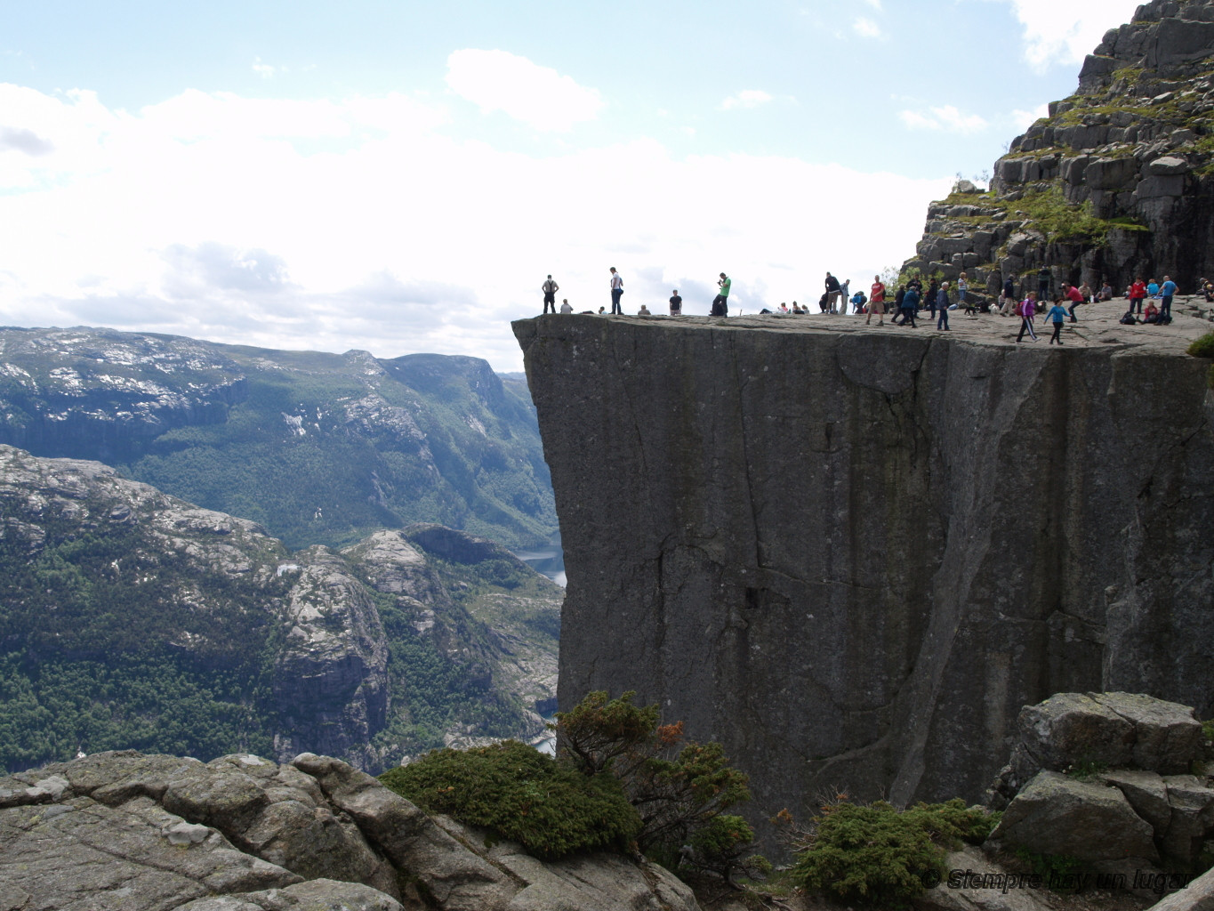 Una vista increíble acompaña a tu llegada. Una línea totalmente vertical cae unos 600 metros hasta alcanzar el fiordo Lysefjord que discurre tranquilamente hacia el Atlántico. Un plataforma corona esa línea vertical, donde se apiñan todos los que han acabado la subida, pero sin que ninguno se atreva a acercarse a menos de un metro del borde. Si alguien se acerca, se tira al suelo y se arrastra para asomarse sobre la espectacular caída. Decir que esta plataforma se encuentra separada del conjunto de la roca por una grieta, todavía no muy ancha, pero que la geología dice que en algún momento provocará la ruptura y la caída de esta maravilla de la naturaleza sobre el fiordo… dentro de muchos, muchos años.