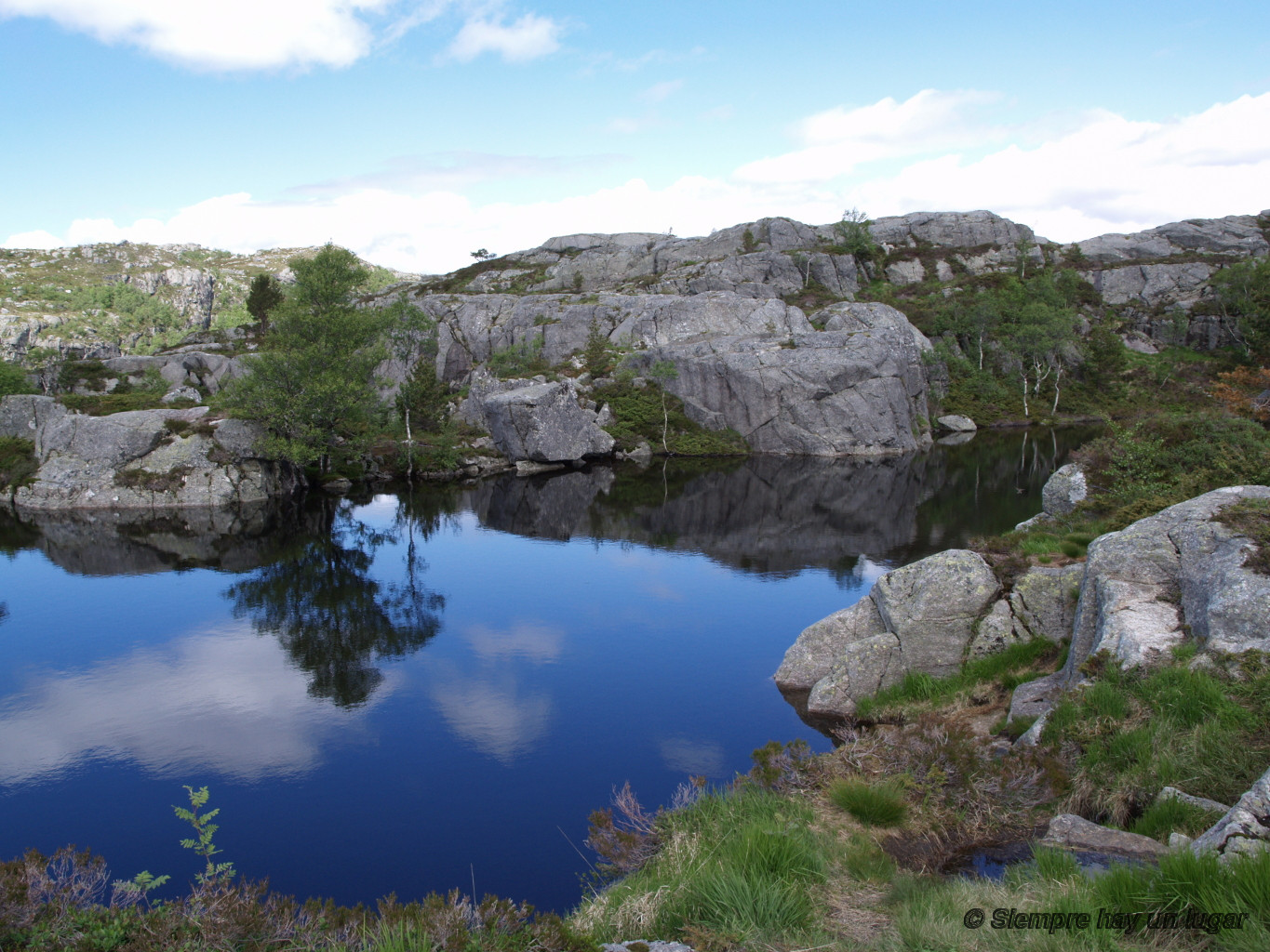 Y cuando bajas del autobús tan solo tienes que seguir la señalización: comienza la subida al Preikestolen. La subida es de dificultad media, con constantes rampas seguidas de pequeños descansos lo que la hace más llevadera. El único tramo complicado está sobre el kilómetro 1’5, cuando comienzas una subida entre piedras que en algún momento se convierte casi en una pequeña escalada. Además, cuando yo subí, las rocas todavía estaban mojadas tras varios días lloviendo y era muy fácil resbalar. Pero tiene su recompensa, porque cuando llegas arriba, sobre el kilómetro 2, el resto del camino es muy sencilla con suaves subidas y mucho llano, pasando entre lagos que son como espejos, hasta que llegas a la cumbre del Preikestolen, tras 3’8 kilómetros y salvar un desnivel de unos 330 metros. Pese a eso, por si alguien duda, tengo que decir que vi llegar arriba familias enteras con niños muy pequeños y personas muy mayores, por lo que es posible subir para casi todo el mundo.